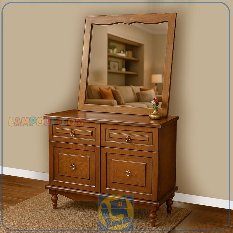 آینه کنسول SCA719، دارای 2 کمد، 2 کشو، 1 آینه قابدار، بدنه از جنس ام دی اف با روکش چوب طبیعی بلوط و پایهها از جنس چوب محکم راش است.