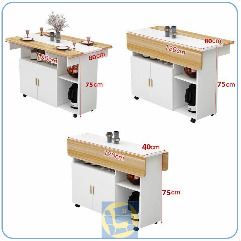 میز نهارخوری تبدیلی DTJ79 به صورت تاشو کمجا به عنوان کابینت و میز بار قفسه دار و چرخ دار در آشپزخانه و پذیرایی و کافی شاپ قرار میگیرد.