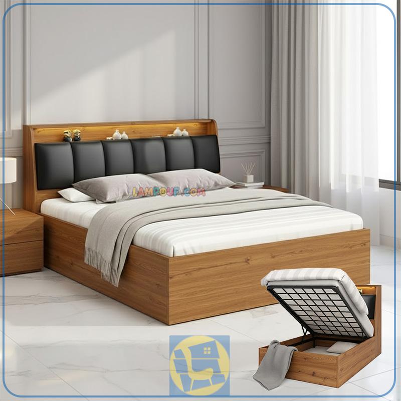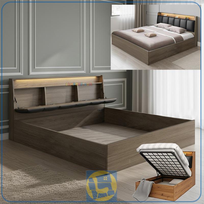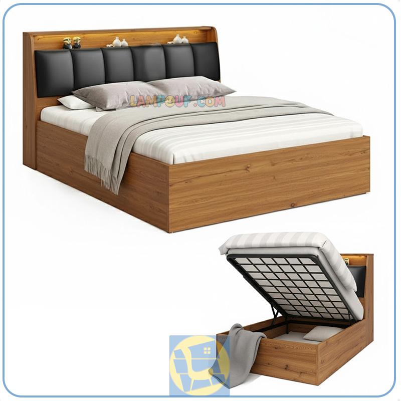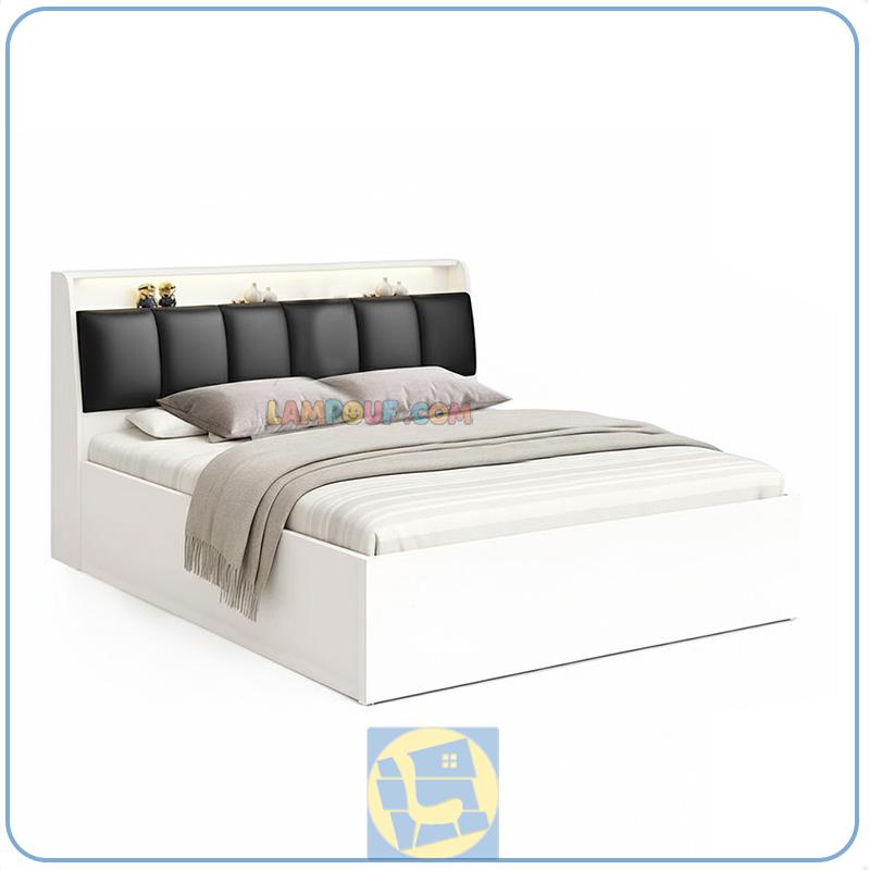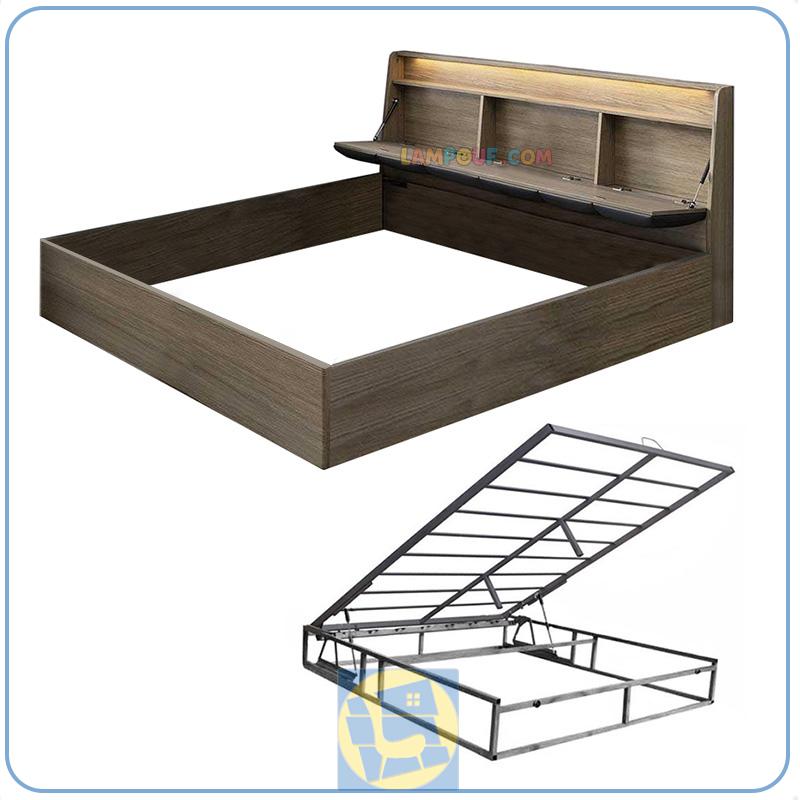 تخت خواب دو نفره جکدار DBJ232 دارای فضای داخلی در قسمت زیر تشک و تاج قفسه دار و درب دار که با دو سایز کینگ و کوئین تولید میشود.