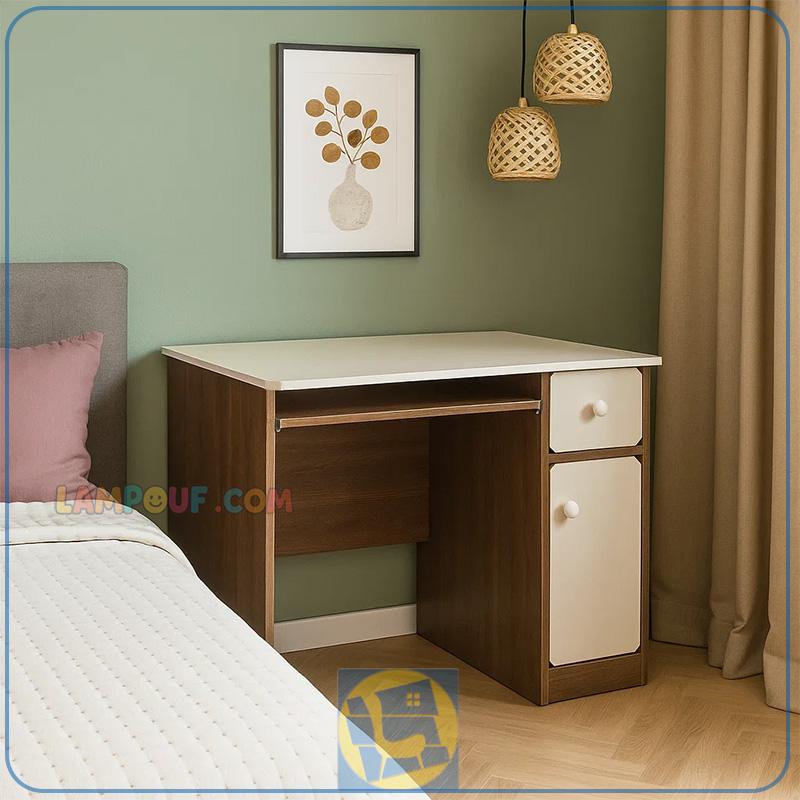 این میز کامپیوتر و میز تحریر با ابعادی با عرض 90 سانتیمتر و عمق 50 سانتیمتر و ارتفاع استاندارد 75 سانتیمتر طراحی شده که میتواند در داخل اتاق خواب شما و در کنار سرویس خواب شما قرار گرفته و فضایی زیبا و منحصر به فرد برای شما به وجود آورد. در طراحی این این میز کامپیوتر و مطالعه از یک کشو و یک درب برای قرار گیری کیس و همچنین میز کشویی کیبورد استفاده شده است. که میتواند فضایی مناسب برای متعلقات کامپیوتر و لپ تاپ را برای شما به وجود آورد.