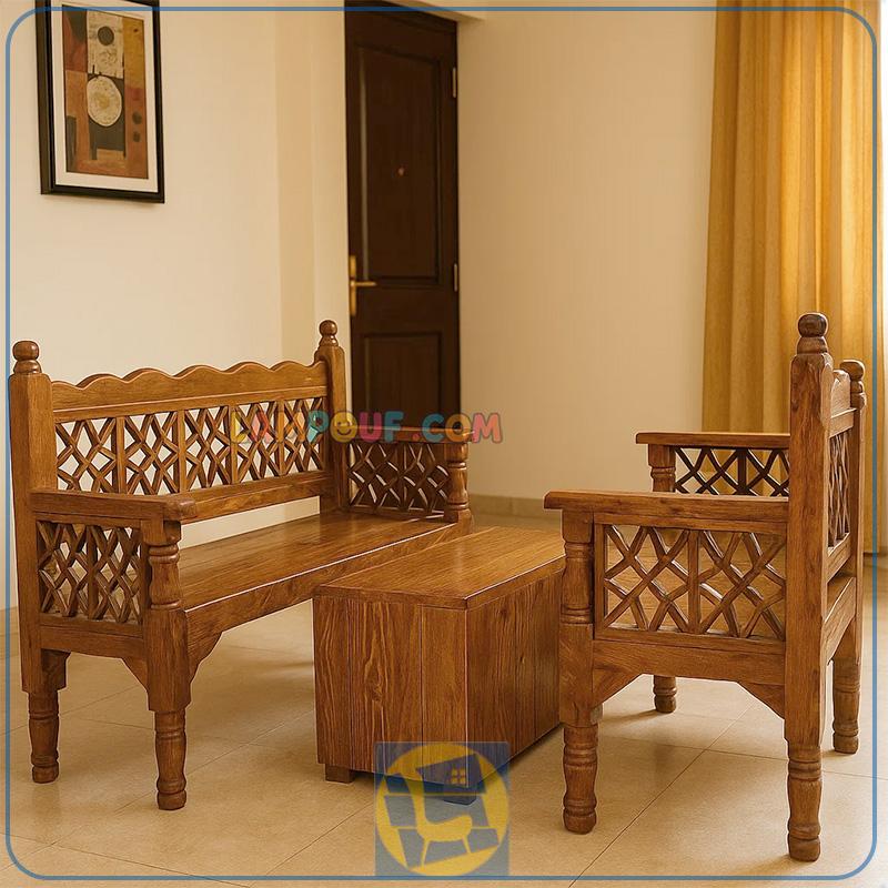 این ست 4 نفره شامل دو عدد تخت دو نفره با ابعادی برابر با 120*60 سانتیمتر میباشد که دارای یک میز پذیرایی به صورت باکس میباشد . این میز پذیرایی و جلومبلی با ابعاد 90*50 سانتیمتر و ارتفاع 45 سانتیمتر در نظر گرفته شده است که میتواند در کنار این تخت های سنتی جلوه زیبایی را به وجود آورد. و یک ست مبلمان چهار نفره سنتی را به وجود آورد.