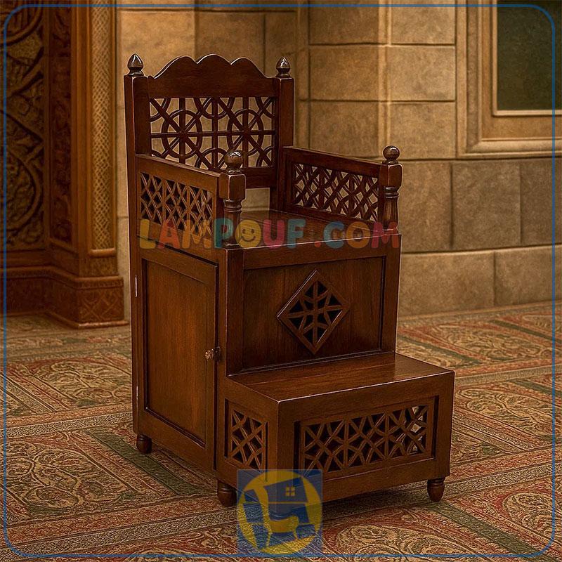 منبر دارای طراحی به صورت سنتی و ساخته شده; به صورت کاملا چوبی که دارای یک پله و یک صندلی میباشد; این منبر میتواند مورد استفاده در داخل حسینیه ها و مساجد و دیگر فضا های مشابه مورد استفاده قرار بگیرد; ساختار این منبر کاملا از چوب ساخته شده است; که از ترکیب چوب سفید و چوب روس میباشد; و میتواند استحکام بسیار بالایی داشته باشد و وزن افراد سنگین وزن را تحمل نماید; این منبر دارای ظرافت بسیار بالا در ساخت بوده و به رنگ های مختلف چوب و همچنین رنگ سفید و یا مشکی نیز ارائه میشود.